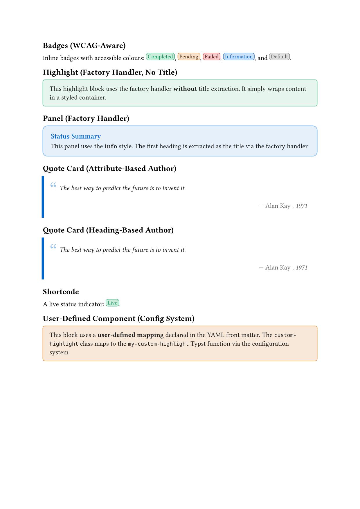 typst_valuemaps Lua types to correct Typst syntax (strings, numbers, keywords, units). - WCAG-compliant badges: iterative contrast adjustment ensures accessible colour combinations.