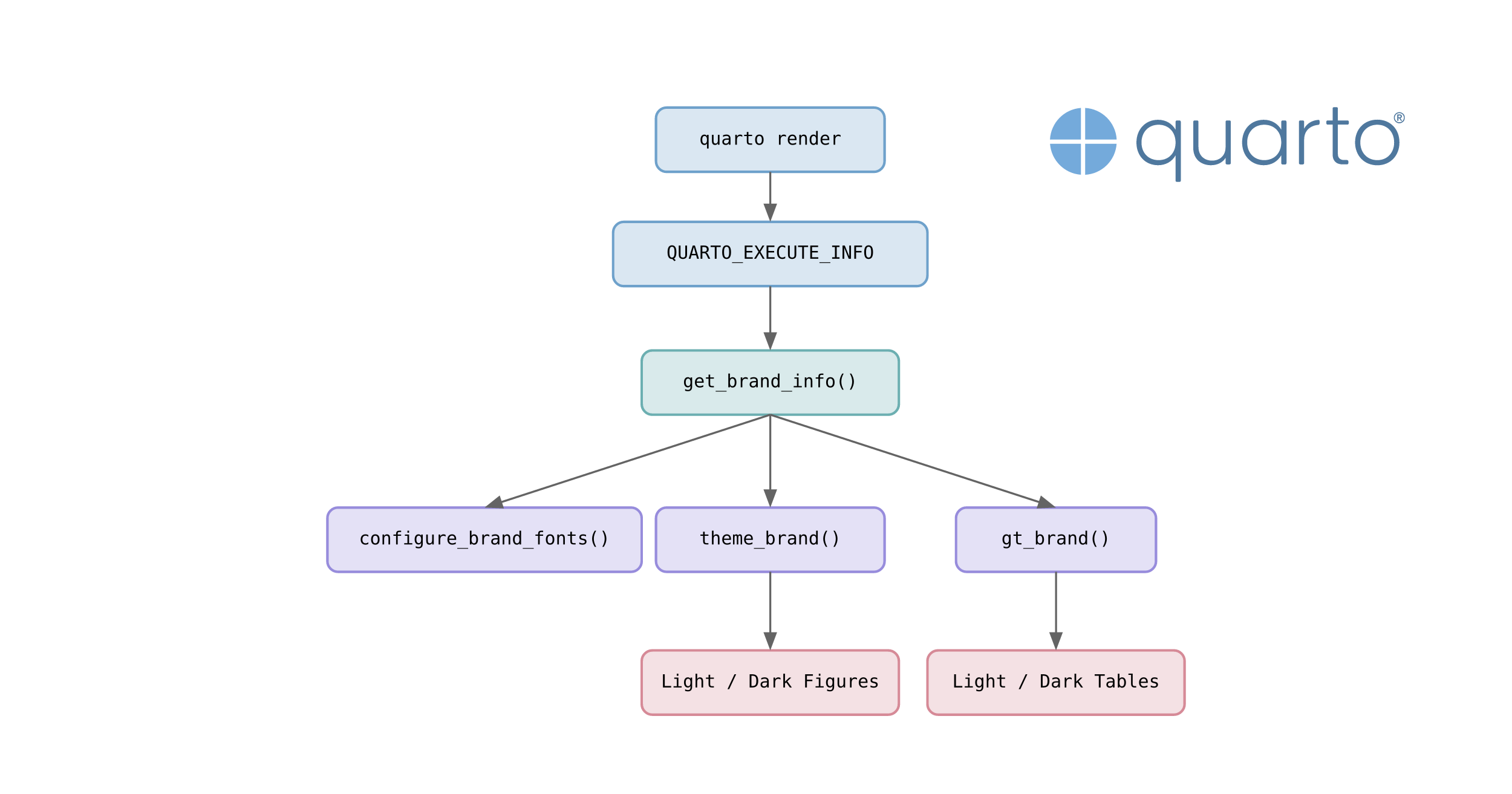 That is the entire pattern. Every helper reads from the same QUARTO_EXECUTE_INFO source, so switching to a different brand configuration is just a matter of changing your _brand.yml file; no code changes are needed.