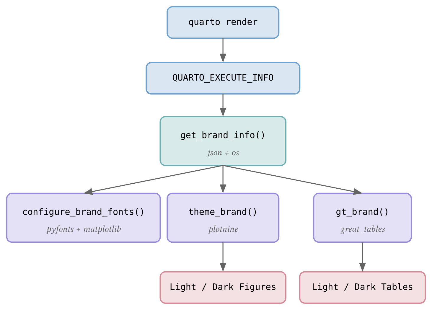When Quarto renders a document, it sets the QUARTO_EXECUTE_INFO environment variable for every code cell. This variable points to a JSON file containing document metadata, format settings, and, crucially, the resolved brand configuration.
